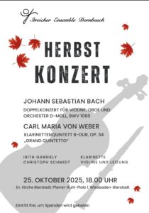 Gemeinsames Konzert mit dem Violinist Christoph Schmidt und seinem Frankfurter Streicher Ensemble Dornbusch, im Programm Bach Doppelkonzert und Weber Quintett