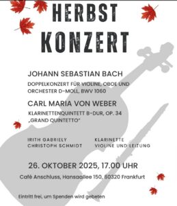 Gemeinsames Konzert  mit dem Violinist Christoph Schmidt und seinem Frankfurter Streicher Ensemble Dornbusch, im Programm Bach Doppelkonzert und Weber Quintett